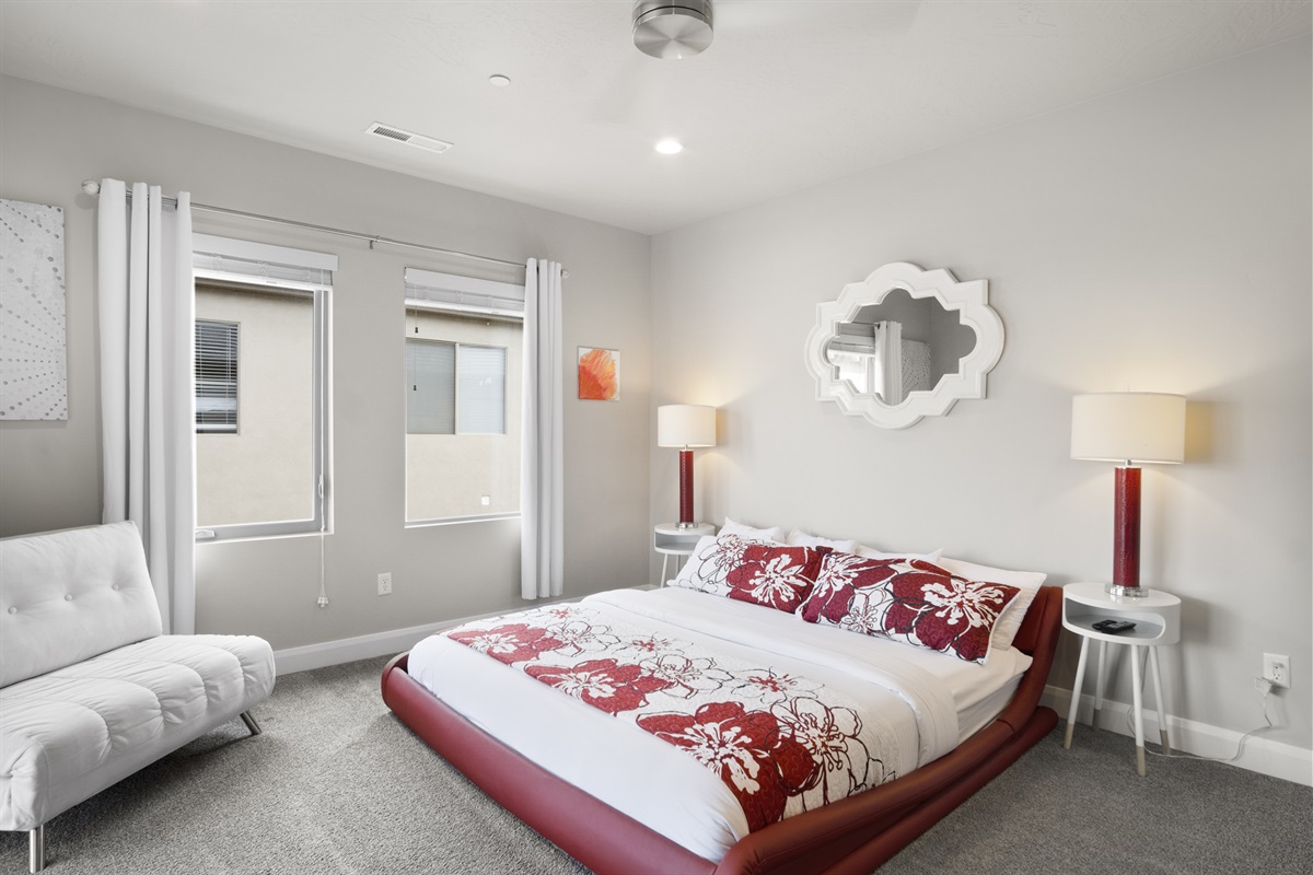 The second bedroom has 1 King bed and a private bathroom. This room boasts vivid purples again with neutral décor to make the bed the shining star, and the large window allows for plenty of natural sunlight.